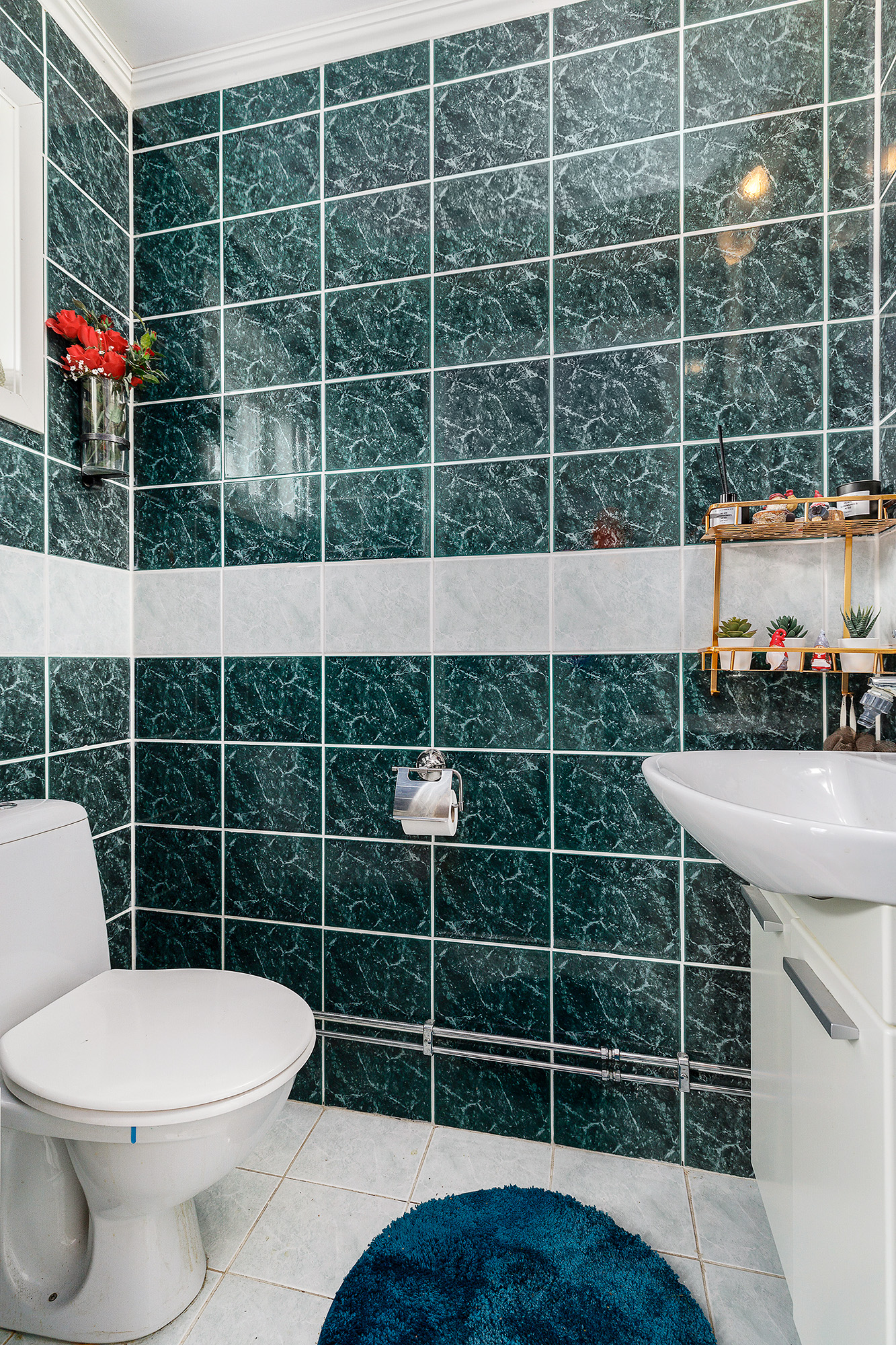 Från hallen nås en gäst-WC med fönster, WC och handfatskommod. Helkaklat på golv och väggar.