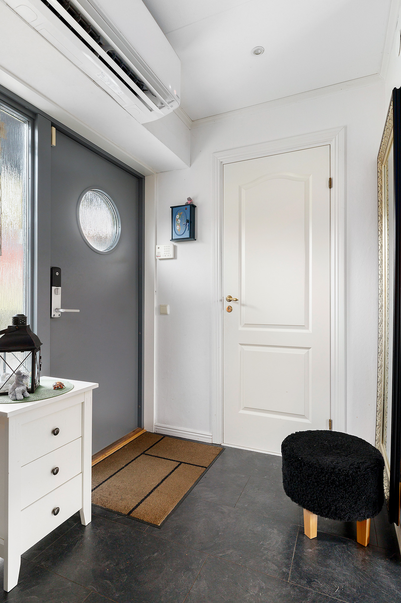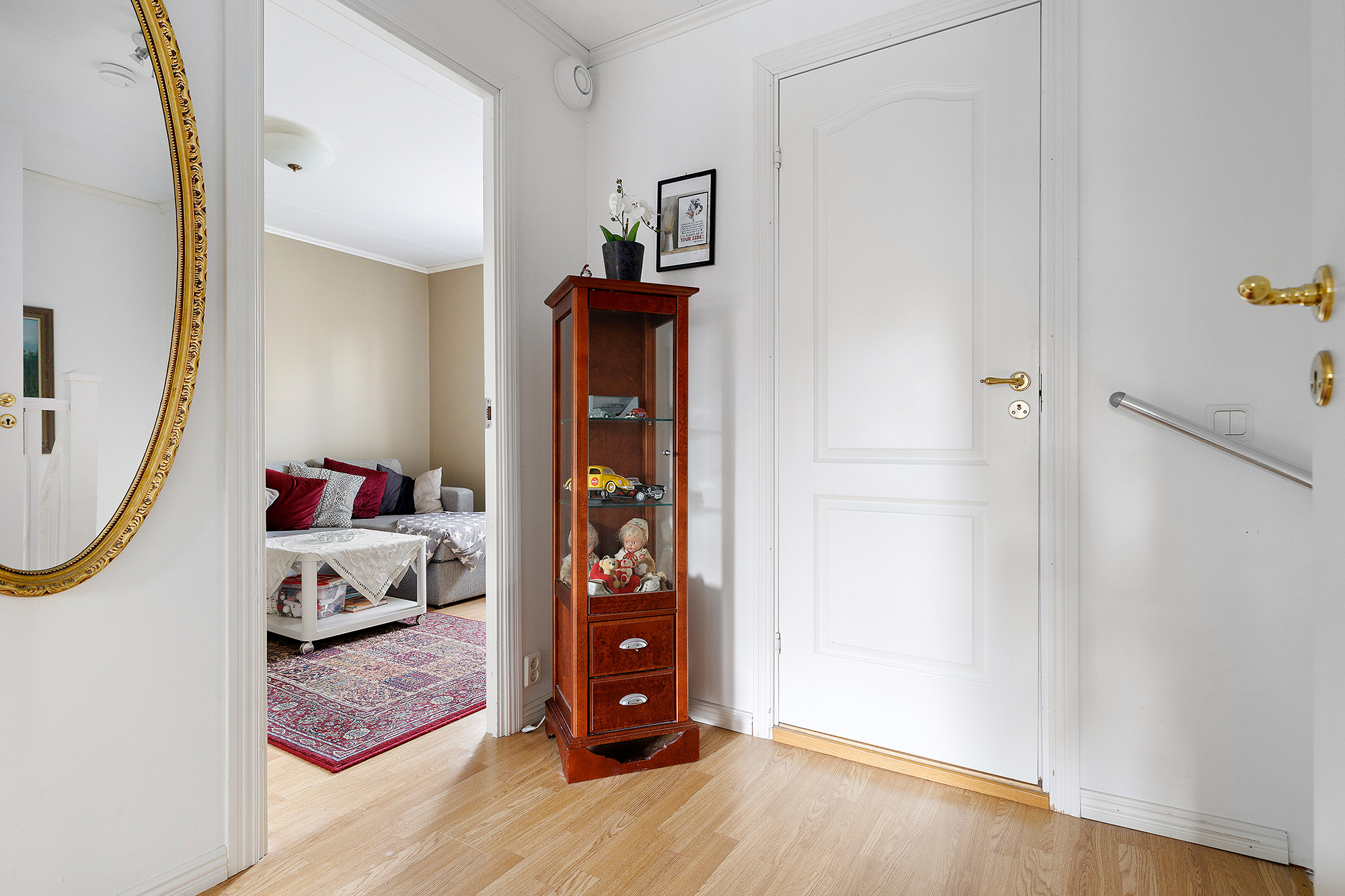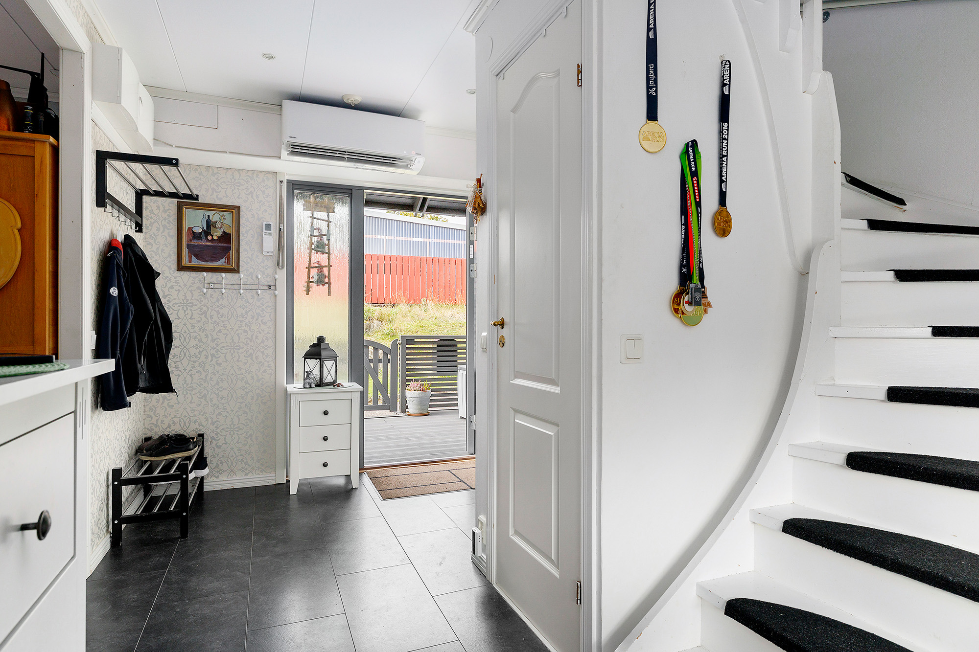 Redan vid entrén så märks det omhändertagna och genomtänkta skicket av med ny ytterdörr med Yale-kodlås. Här finns plats för skoställ, hatthylla och övriga möbler. Extra förvaring finns i förråd under trappen. Laminatgolv och på väggarna sitter ljus tapet.
