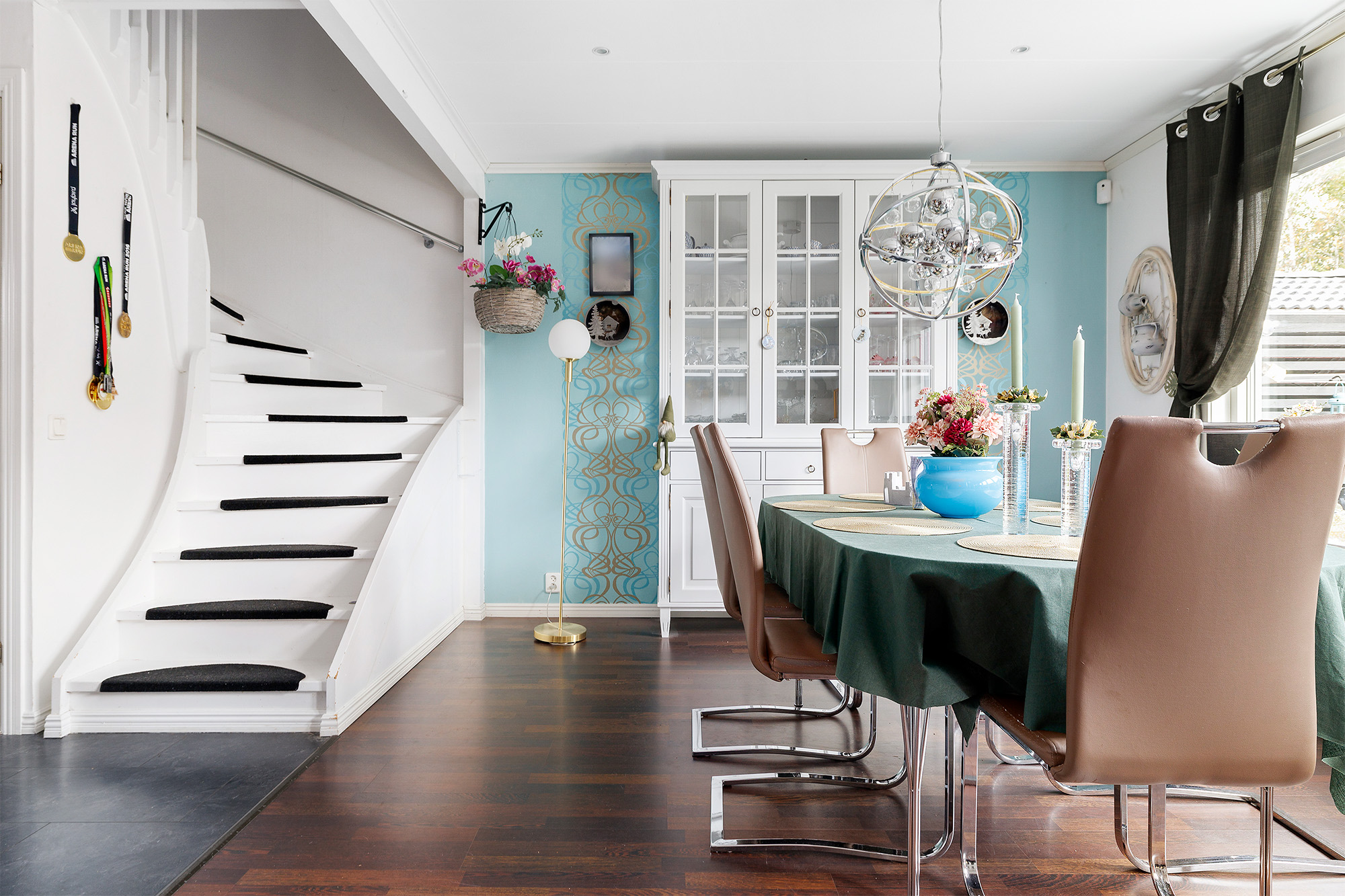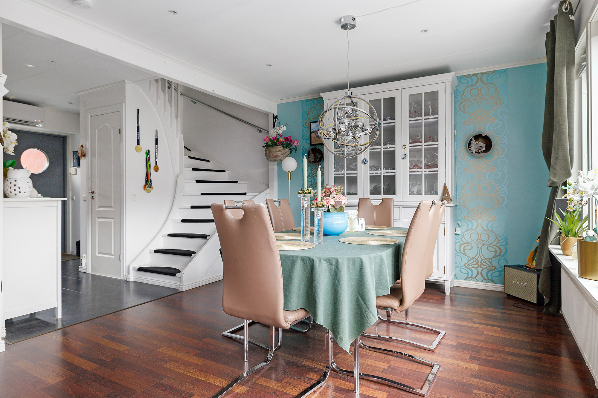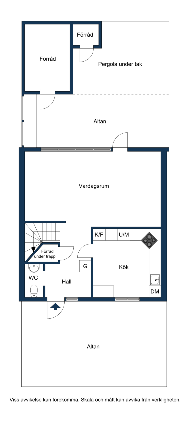 Redan vid entrén så märks det omhändertagna och genomtänkta skicket av med ny ytterdörr med Yale-kodlås. Här finns plats för skoställ, hatthylla och övriga möbler. Extra förvaring finns i förråd under trappen. Laminatgolv och på väggarna sitter ljus tapet.