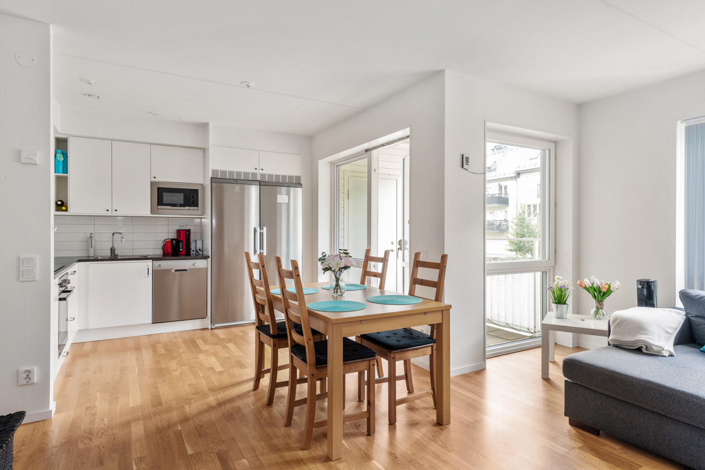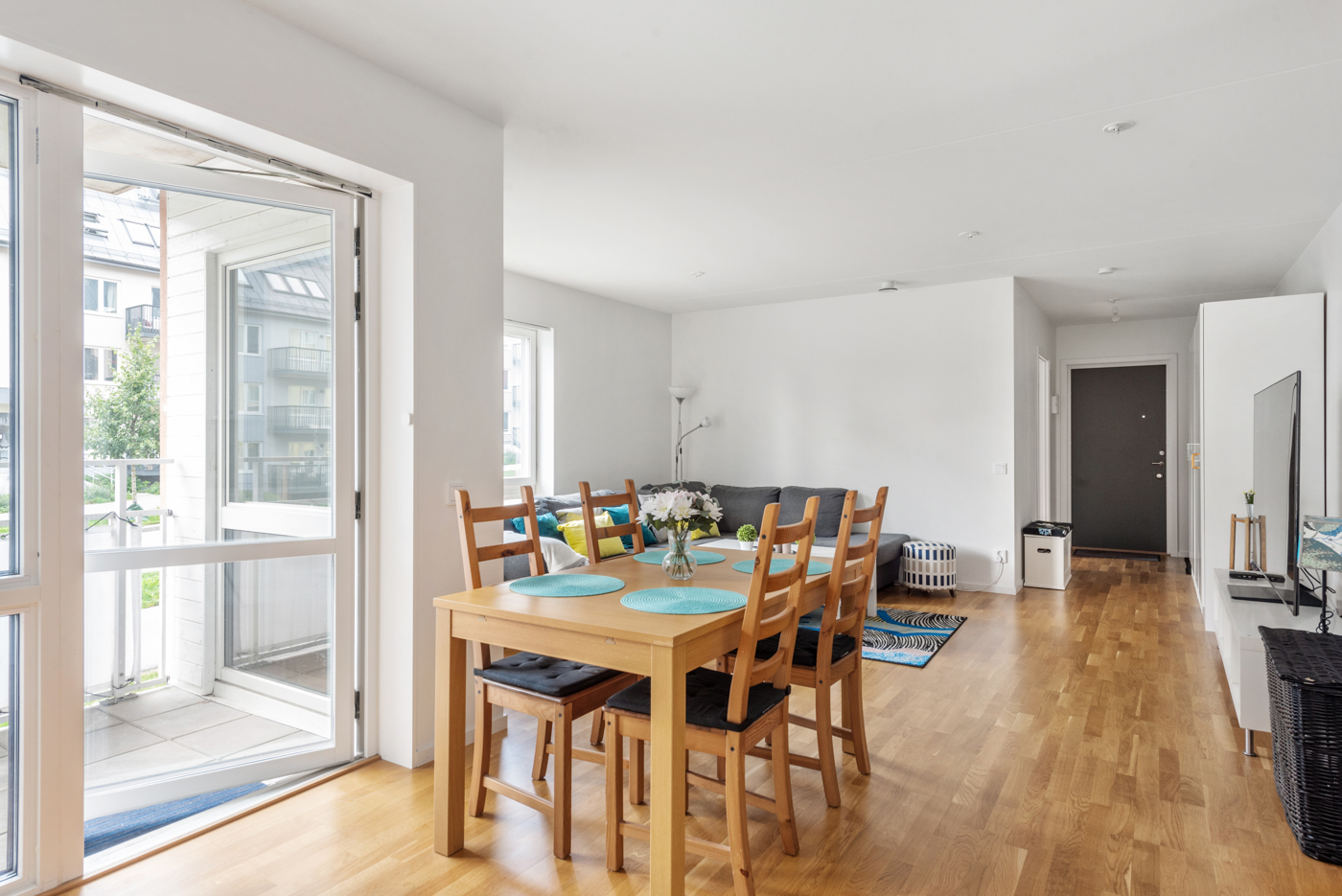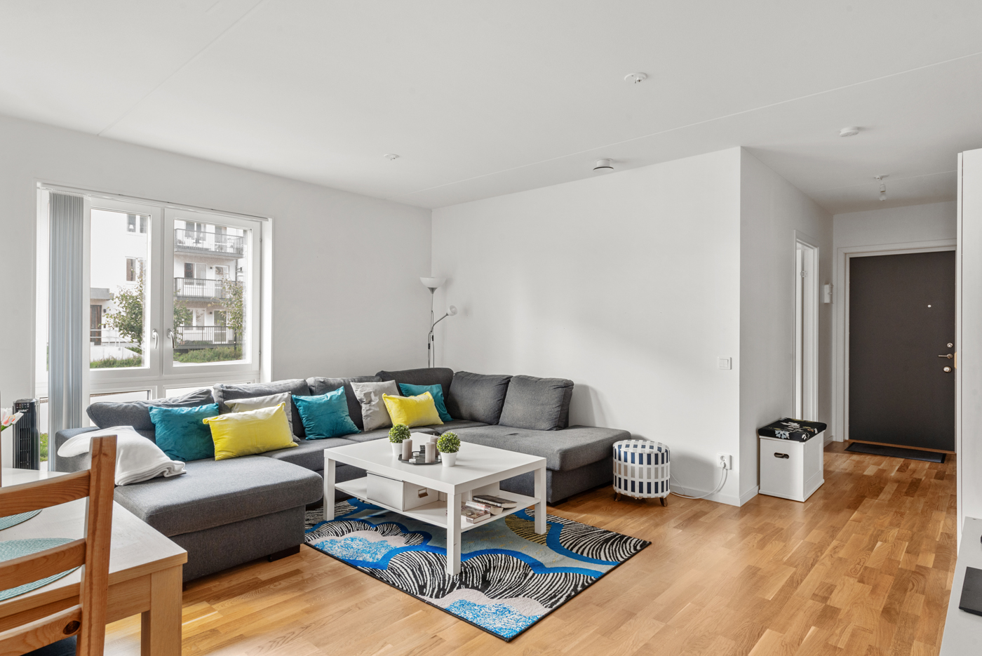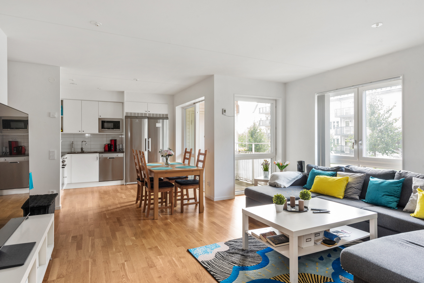Ljust vardagsrum med trivsam och social planlösning. Här ryms större soffgrupp och övriga möbler. Öppet mot kök och given plats för matbord mellan köket och vardagsrummet, samt utgång till balkongen via köket. Ekparkett på golvet och vitmålade väggar.