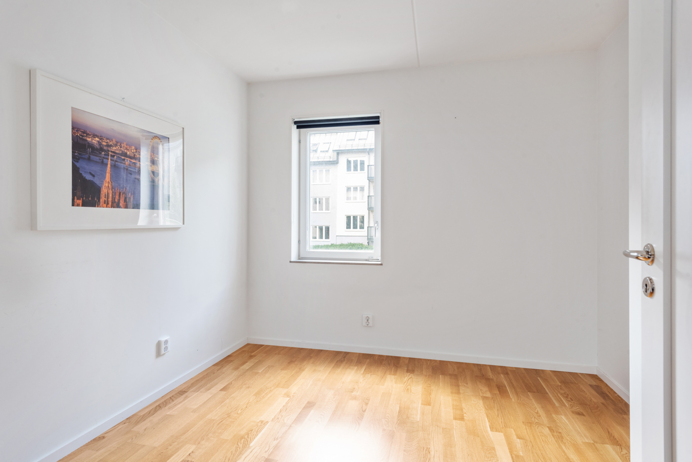 Rymligt sovrum som är enkelt att möblera. Garderob och linneskåp finns. Ekparkett på golvet och vitmålade väggar.