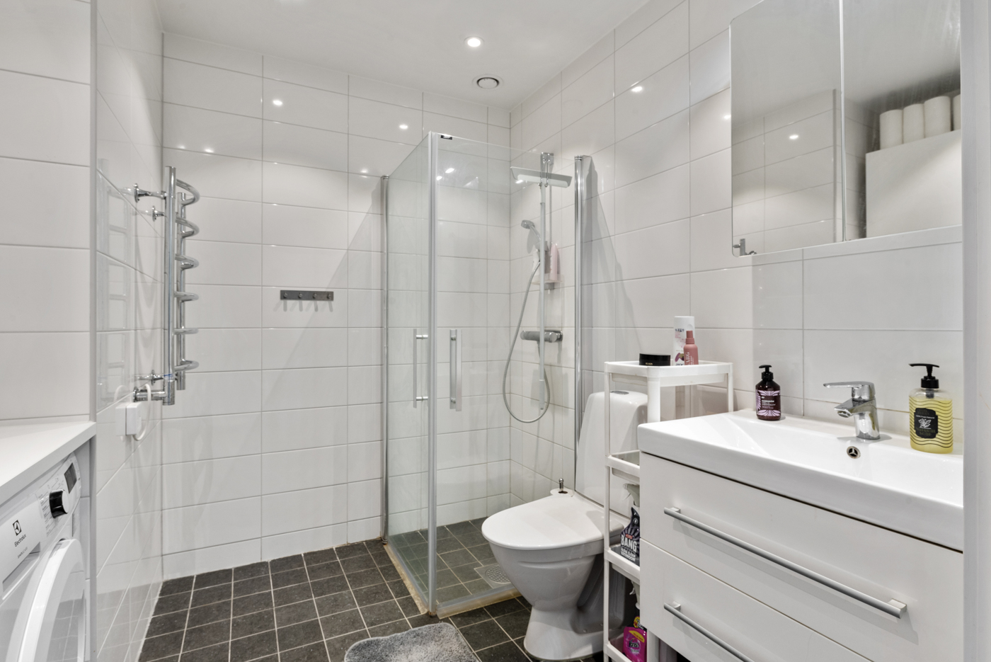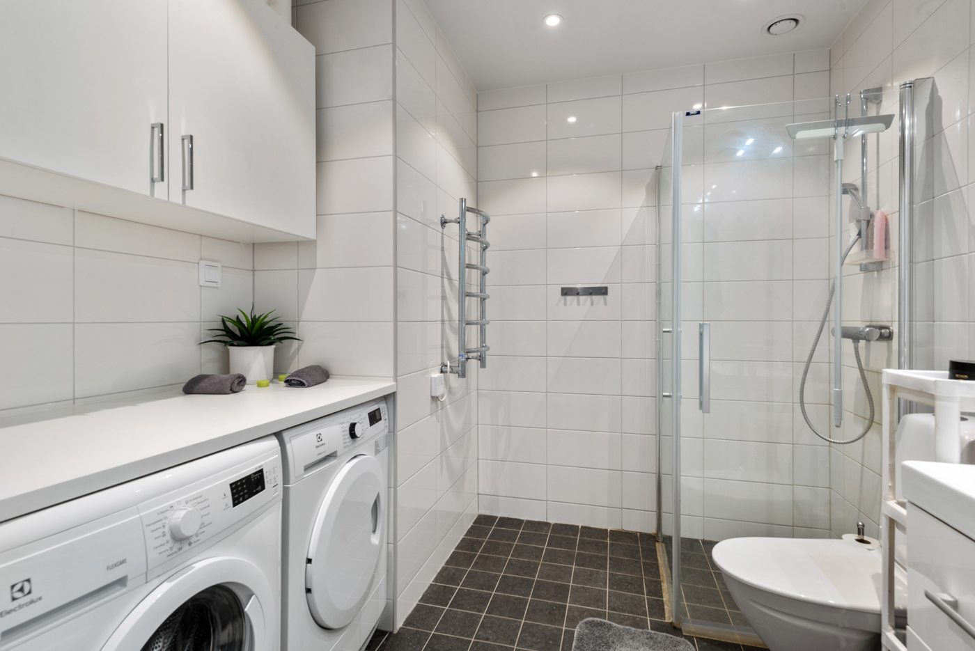 Modernt badrum med vitt liggande kakel på väggarna och ett mörkgrått klinkergolv med golvvärme. Dusch bakom vikbara duschdörrar i glas, bred handfatskommod med tillhörande förvaring och uppvärmd handdukstork. Badrumsskåp med spegelluckor och belysning samt infällda spotlights i taket. Tvättmaskin och torktumlare med arbetsbänk ovan samt förvaring i två skåp.