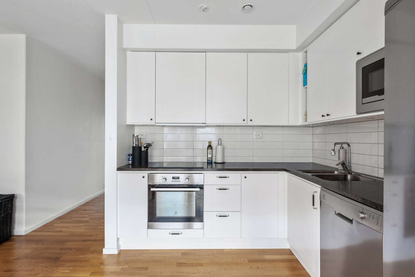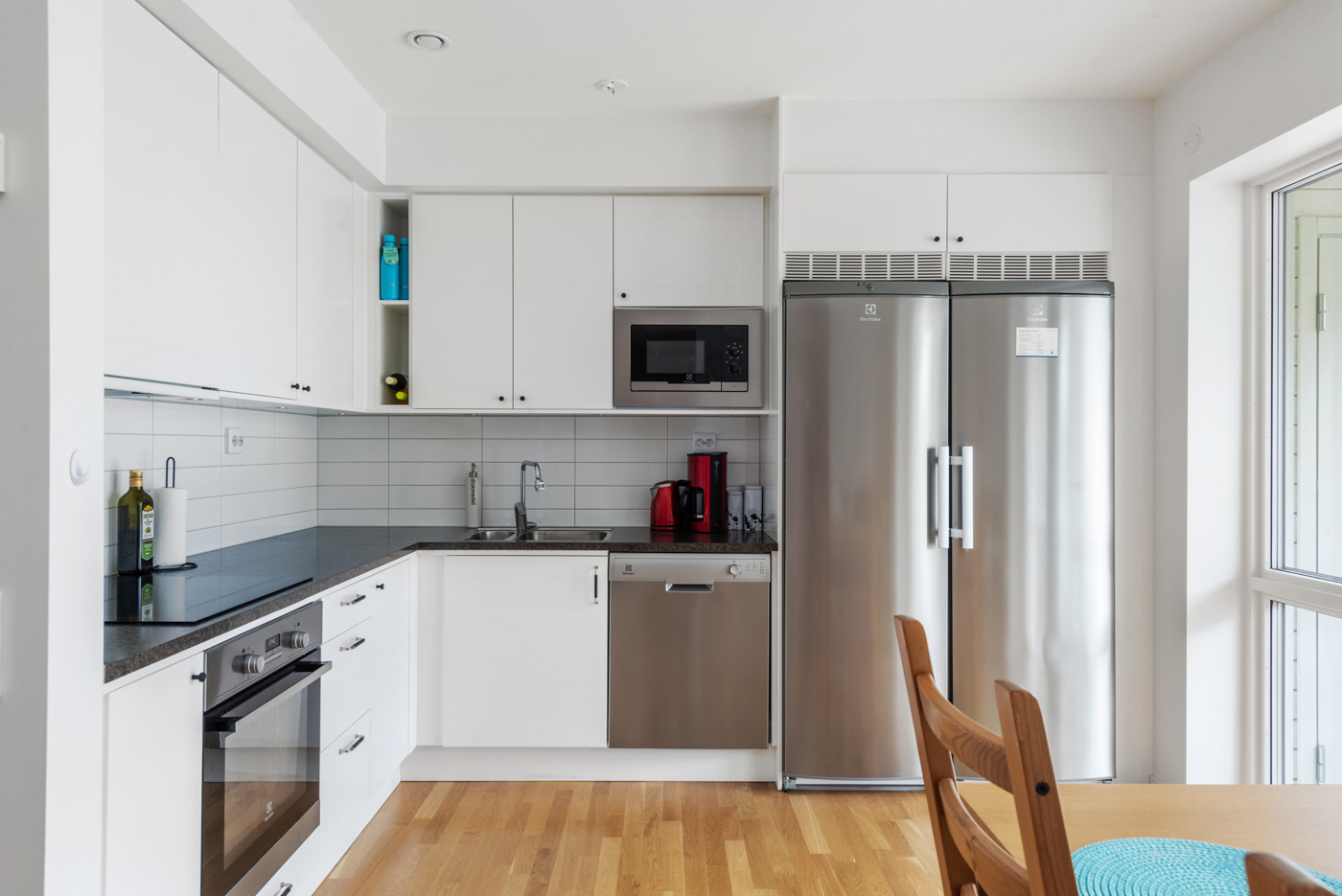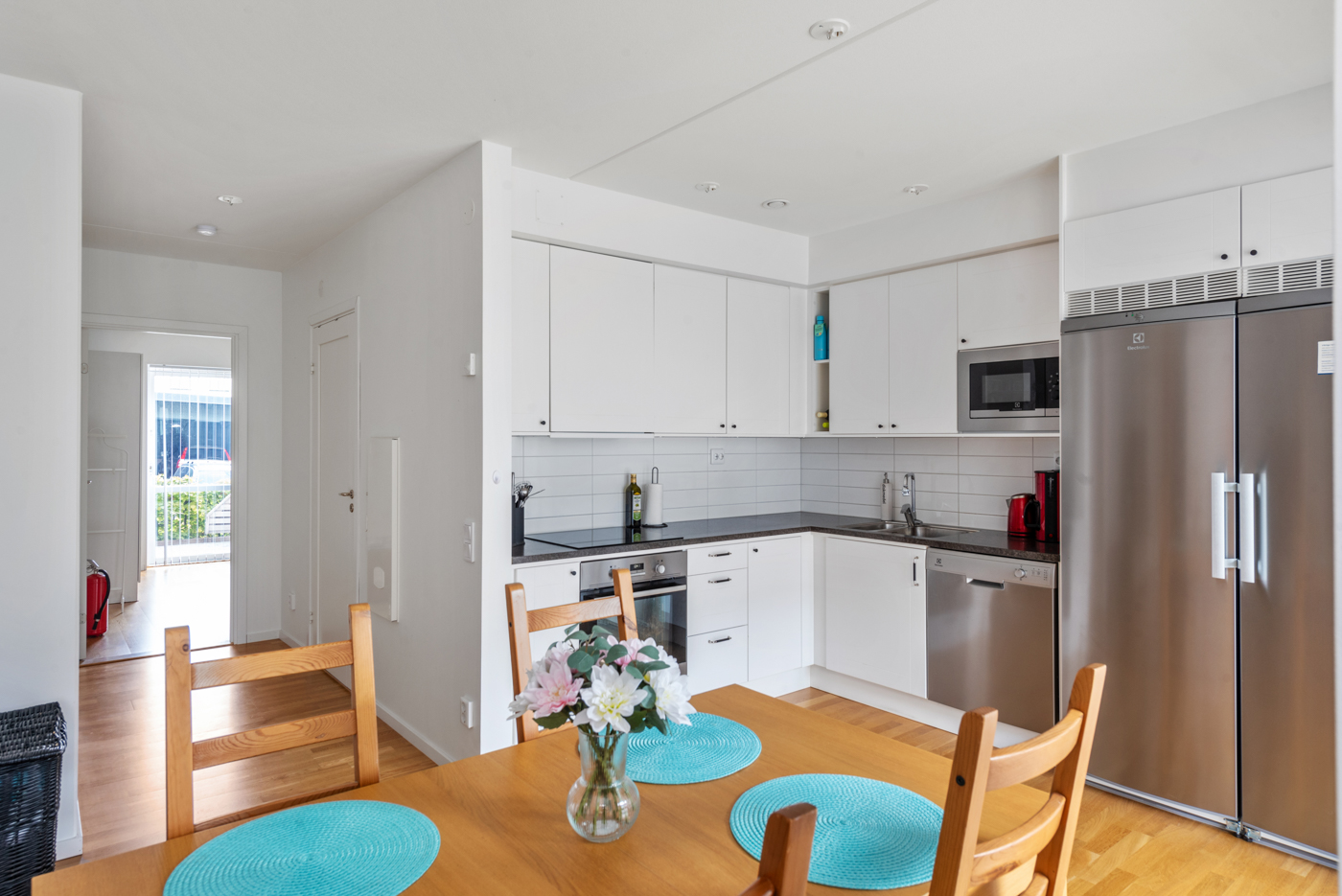 Påkostat kök från Vedum och maskiner från Electrolux. Köket går i vitt med vitt liggande kakel ovan köksbänken och maskiner i rostfritt. Beslag i borstat stål. Kökets L-form ger gott om arbetsyta på köksbänken och även gott om förvaring i skåp. Bra belysning över köksbänk och tack vare den öppna planlösningen får köket mycket ljus. Given plats för matbord mellan vardagsrum och kök samt nära utgång till balkongen. Maskinparken består av induktionshäll, ugn, diskmaskin, inbyggd micro samt kyl och frys i fullhöjd. Ekparkett på golvet och vitmålade väggar.
