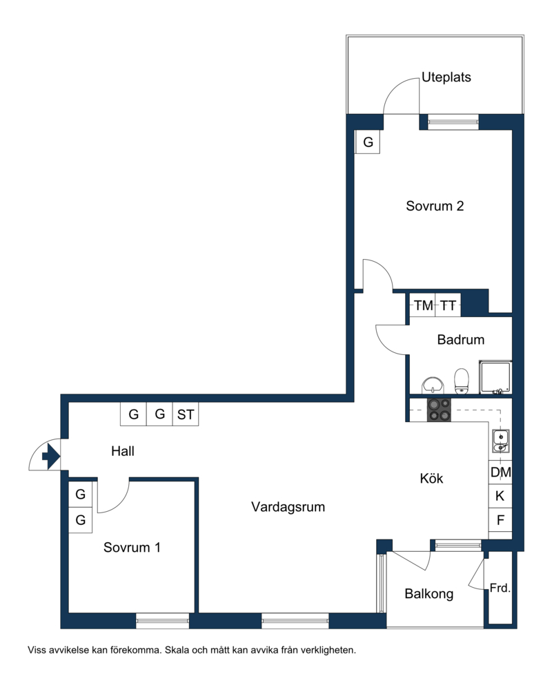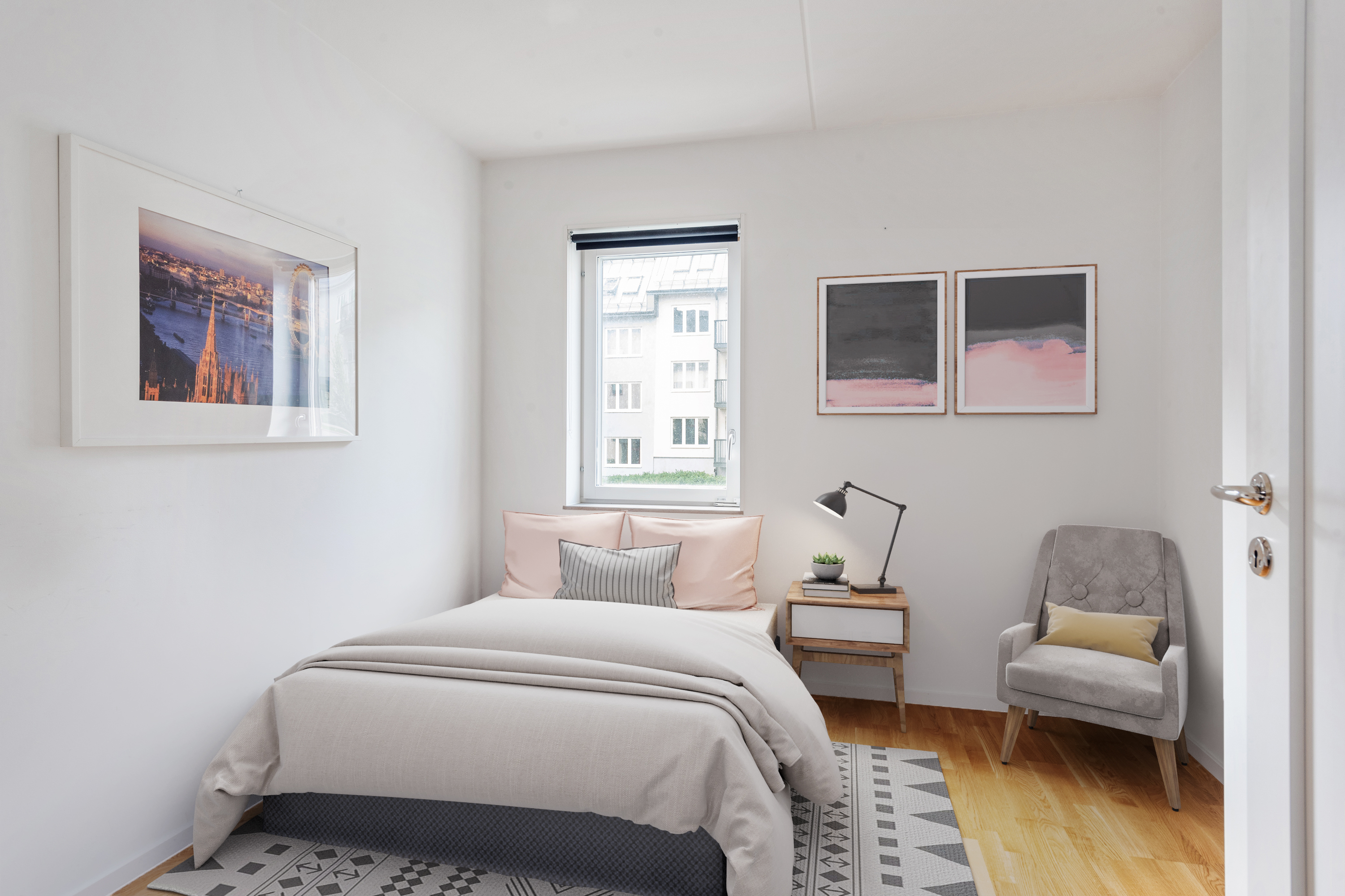 Möbleringen i sovrum 1 är digitalt redigerad i efterhand.