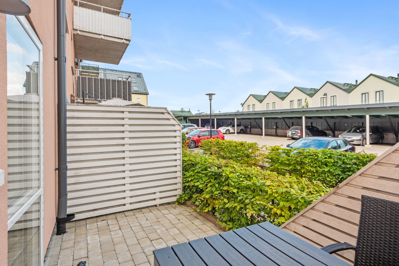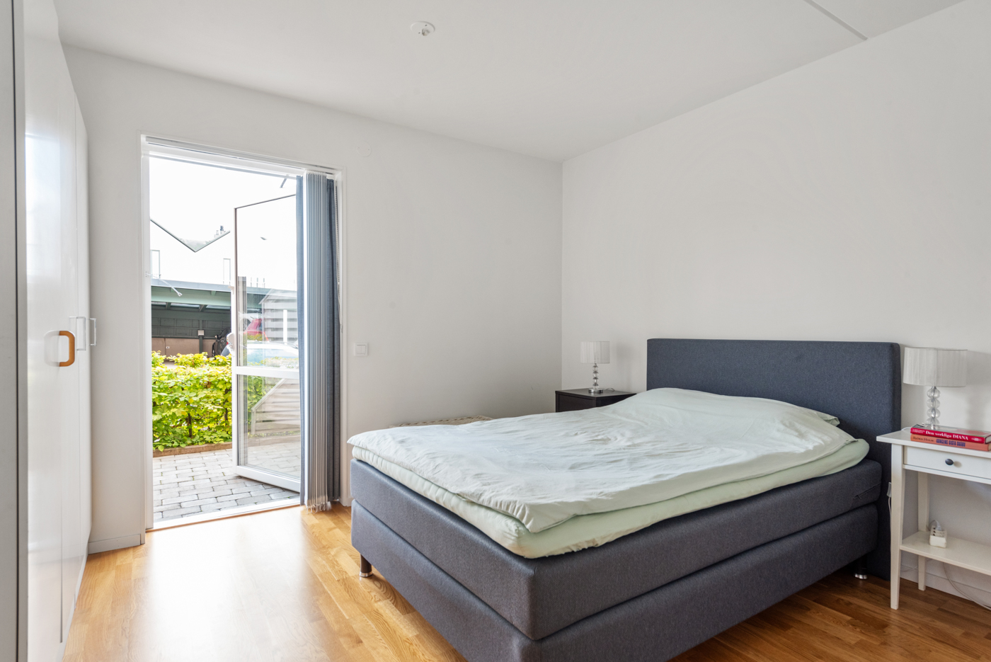 Master Bedroom med utgång till uteplatsen. Sovrummet är enkelt att möblera. Här ryms dubbelsäng, nattduksbord, skrivbord och övriga möbler som garderober och byrå. Här finns tre garderober, samt ett utrymme med plats för ytterligare förvaring. Ekparkett på golvet och vitmålade väggar.