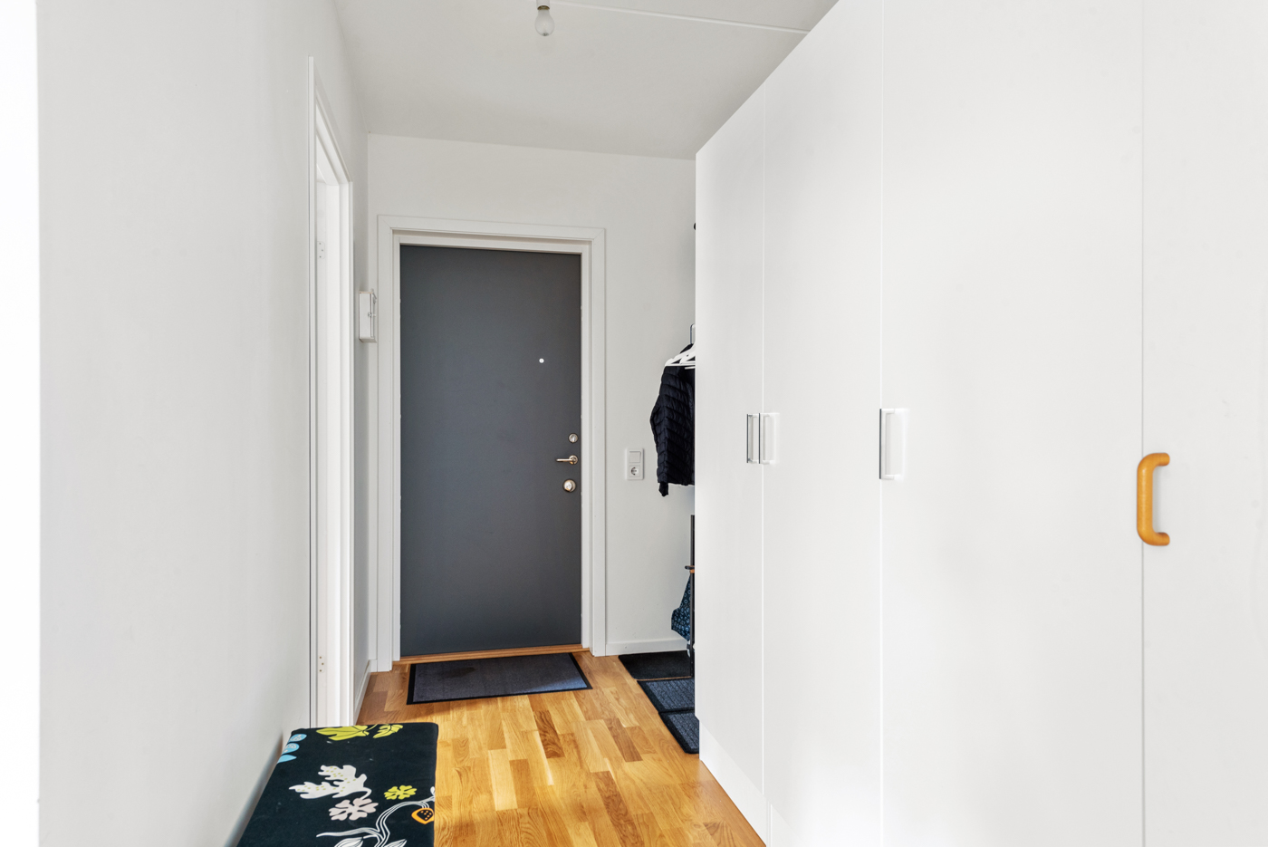 Ljus och välkomnande hall med plats för klädhängare och skoställ. Här står 3 st garderober och 1 städskåp som ger bra förvaring. Ekparkett och vitmålade väggar. I hela lägenheten ligger vattenburen golvvärme vilket är både behagligt och avsaknaden av radiatorer på väggarna ger lägenheten ett stilrenare intryck och lättare att möblera.